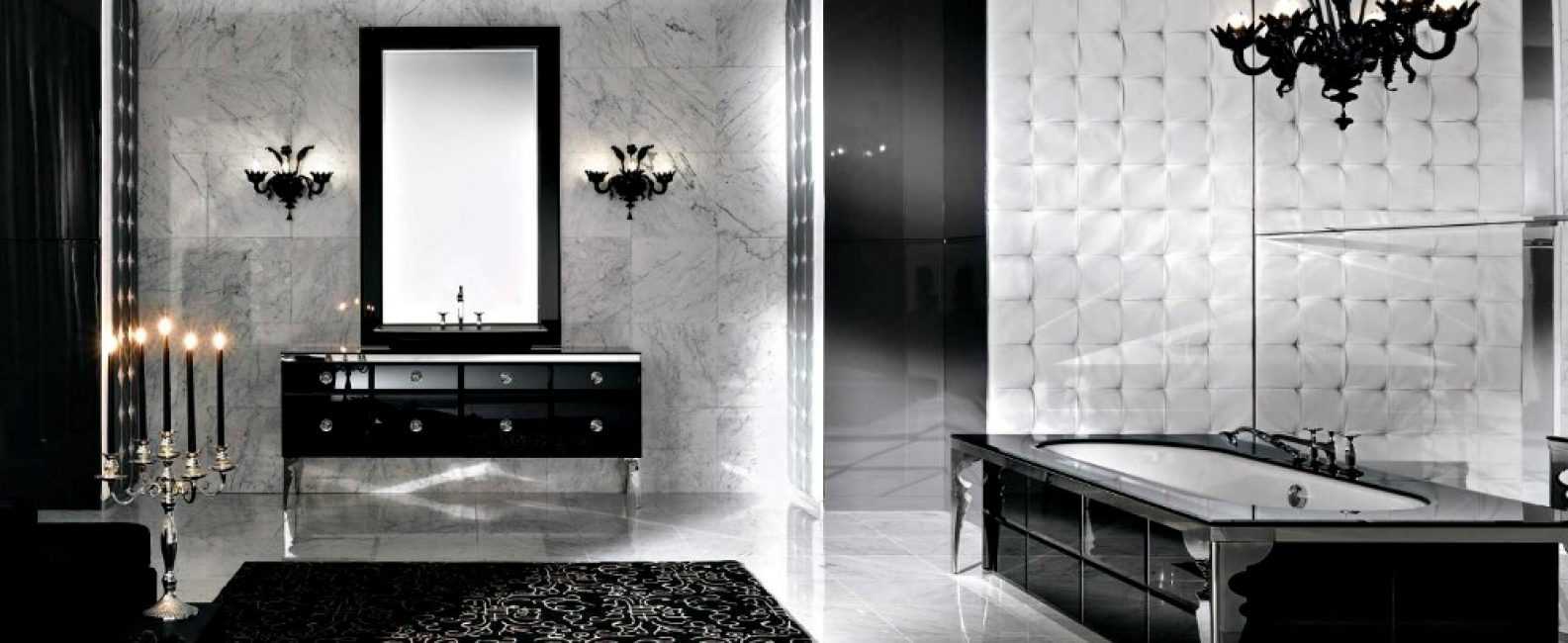 Изредка в дизайне присутствует впечатляющий декор в виде фонтана или его имитации. Для ванной также обязательно использование больших зеркал в эксклюзивном обрамлении или без него.