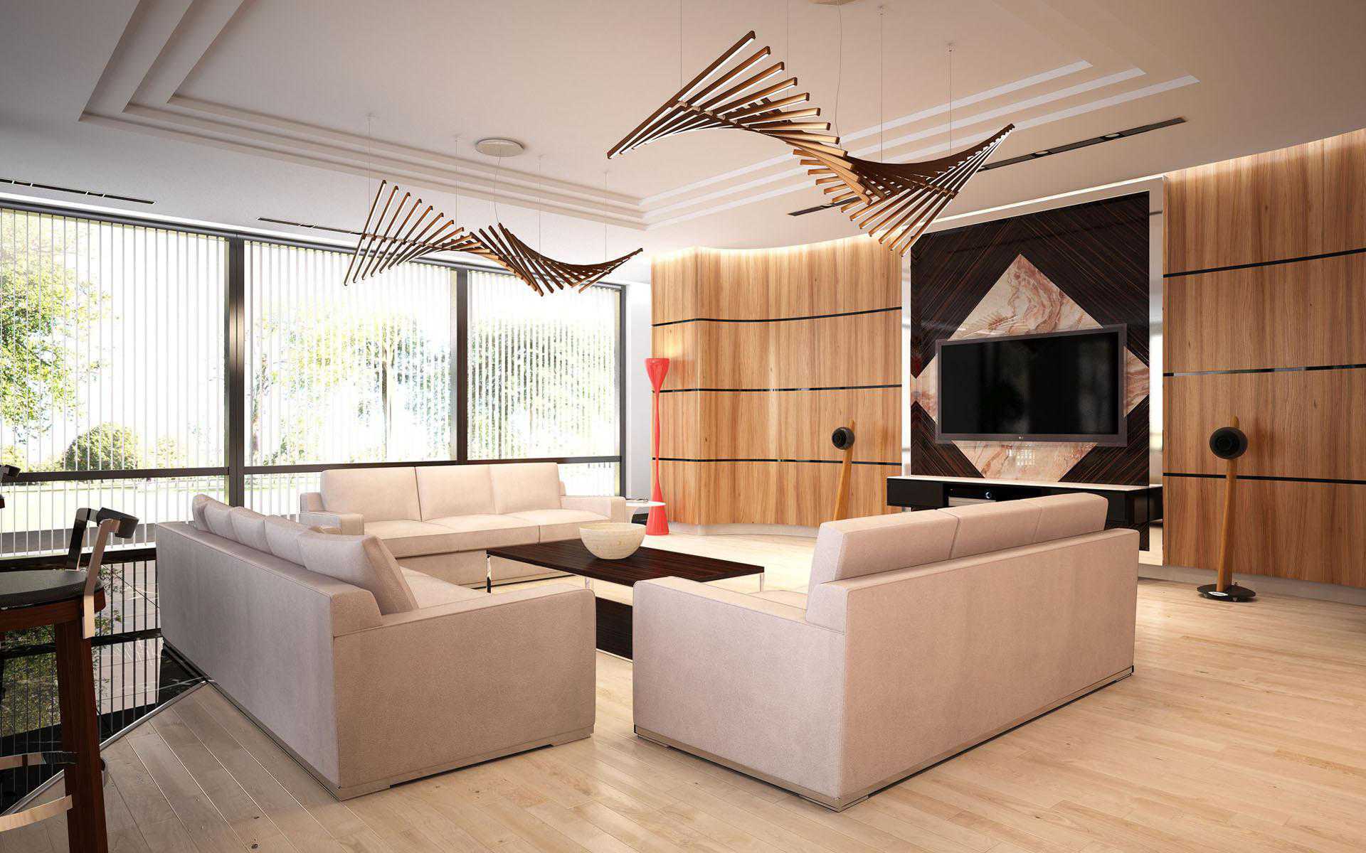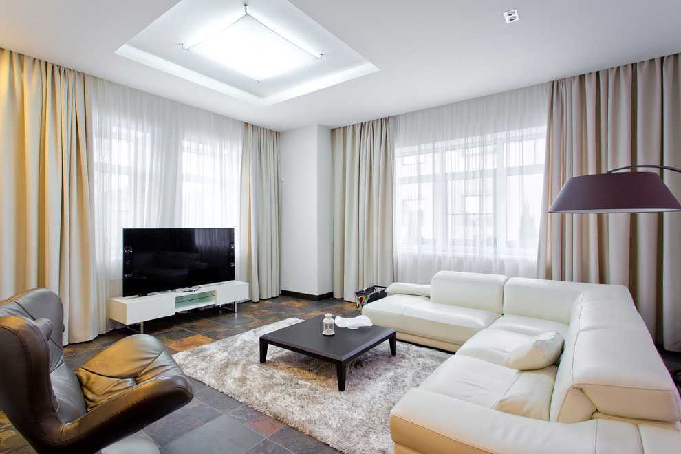 Потолок. Он должен быть высоким, светлым и однотонным; предпочтительны серые, песочные и бежевые оттенки. Если площадь помещения позволяет, устанавливаются натяжные многоуровневые потолки, которые могут нести дополнительную функцию зонирования. Потолки, сложные по форме, дополняются точечной и скрытой подсветкой.