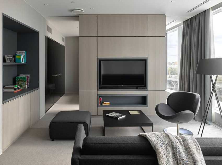 Гостиная. Она часто представляет единое пространство с кухней и столовой. Чтобы помещение не выглядело загруженным, используют встроенную мебель. Лаконичный фасад встроенного шкафа, лишенный декора и ручек, наилучшим образом соответствует требованиям стиля. Мягкая мебель (кресла и диваны) должна иметь простую прямоугольную или квадратную форму, без легкомысленных изгибов и гнутых ножек. Панорамное окно и вид, открывающийся из него, могут стать главной частью интерьера гостиной.