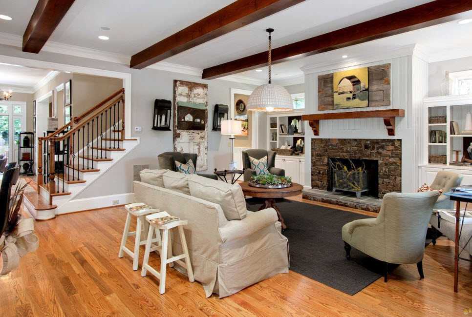 При наличии камина – его зону также следует качественно обыграть. Поставьте туда кресло-качалку, добавьте кофейный столик, торшер, организуйте мини-бар. Примеры того, как может выглядеть эта часть гостиной в американском стиле, смотрите на фото.