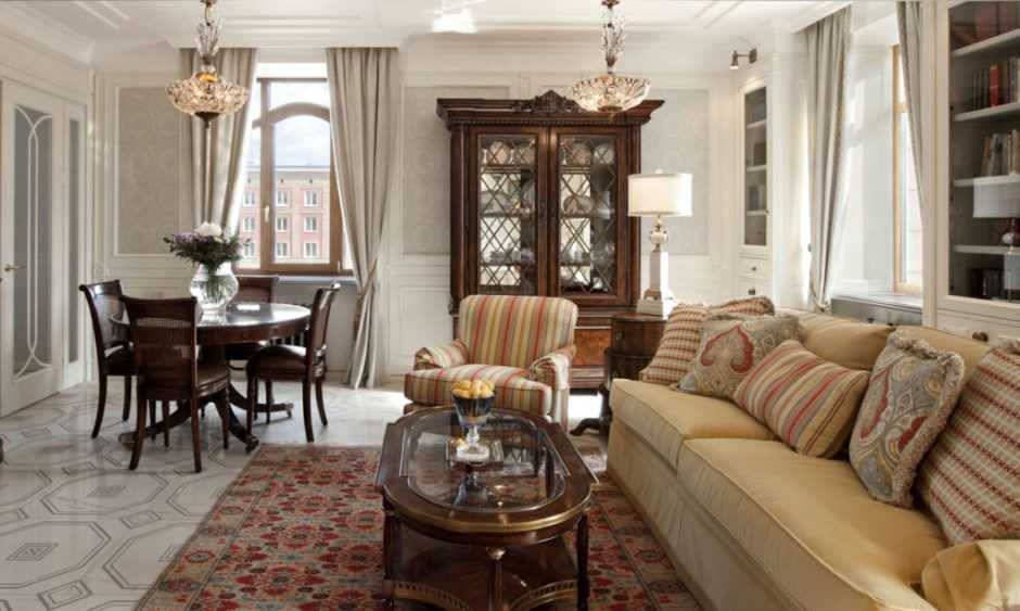 - мебель должна быть практичной и функциональной, но ее количество может быть не минимально необходимым. Обивка мягкой мебели и текстиль отличаются полосатым орнаментом;