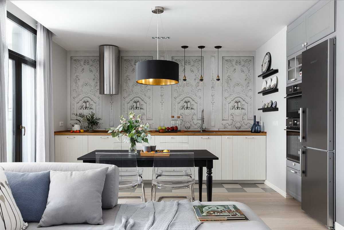 Черная бытовая техника на белой кухне — довольно популярное и практичное решение. Из-за повышения контрастности интерьера практически на максимум, такое сочетание подойдет только для современных и немного грубых стилей вроде лофта, арт-деко и скандинавского минимализма. Чтобы дизайн вышел законченным, столешницу лучше выбрать черную.
