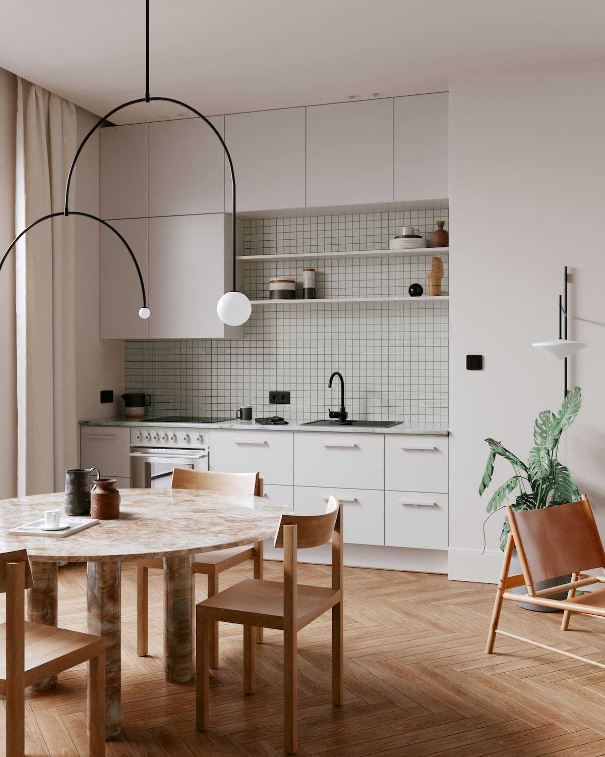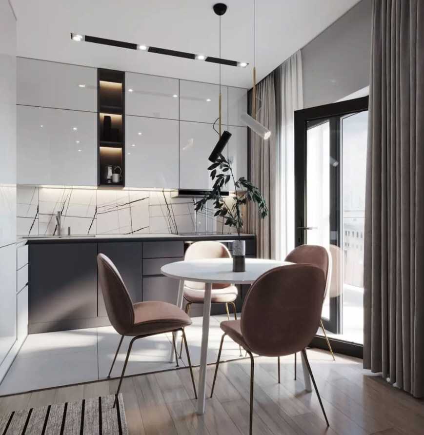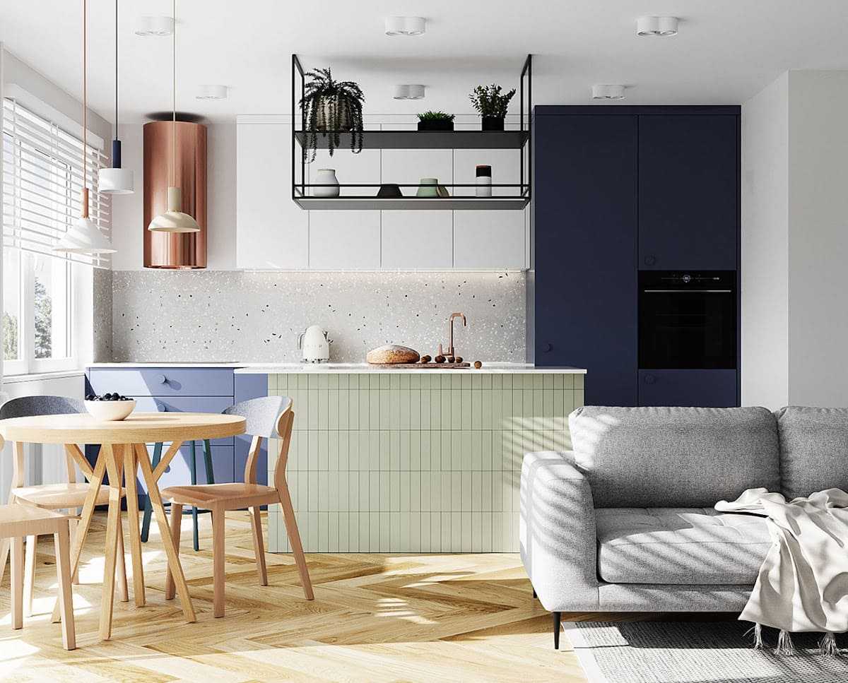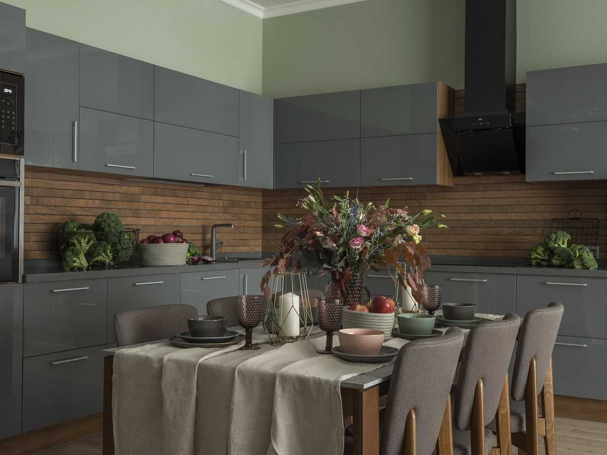 Разрабатывая дизайн-проект модной кухни 2022 важно помнить, что очень светлые и темные цвета должны занимать наименьшую долю пространства – не более 10%. Окончательно расставить акценты в помещении помогут элементы декора