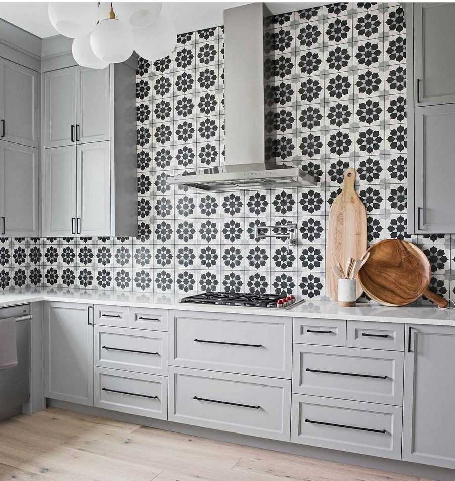 Особенно стильно он выглядит в «шахматной» отделке пола и фартука, в виде декора (фоторамок, статуэток, ваз) и в виде принтов на текстиле/обоях.