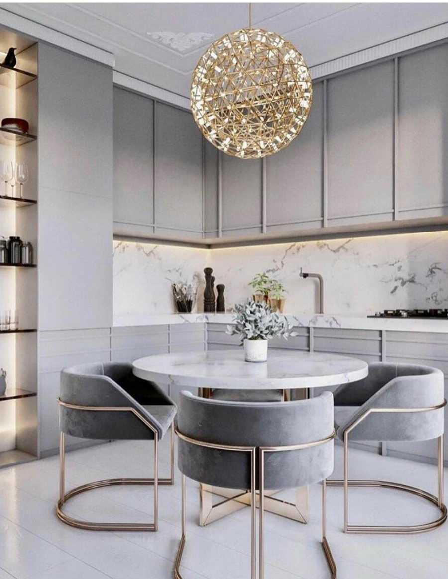 Особое внимание следует уделить освещению, которого должно быть много по периметру всей кухни. В самом ее центре можно установить подвесную люстру в серебристых тонах