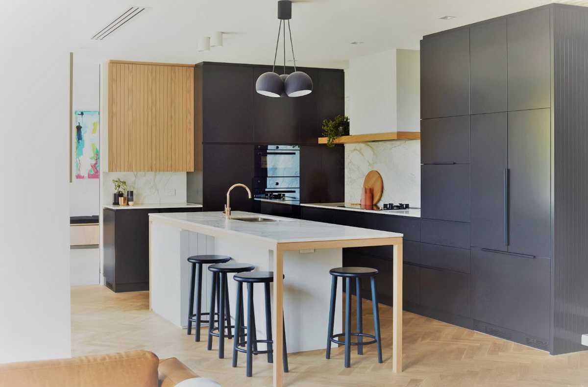 Этот смелый дуэт можно воплотить в жизнь только на больших кухнях, ведь черный гарнитур будет поглощать свет и зрительно уменьшать пространство.