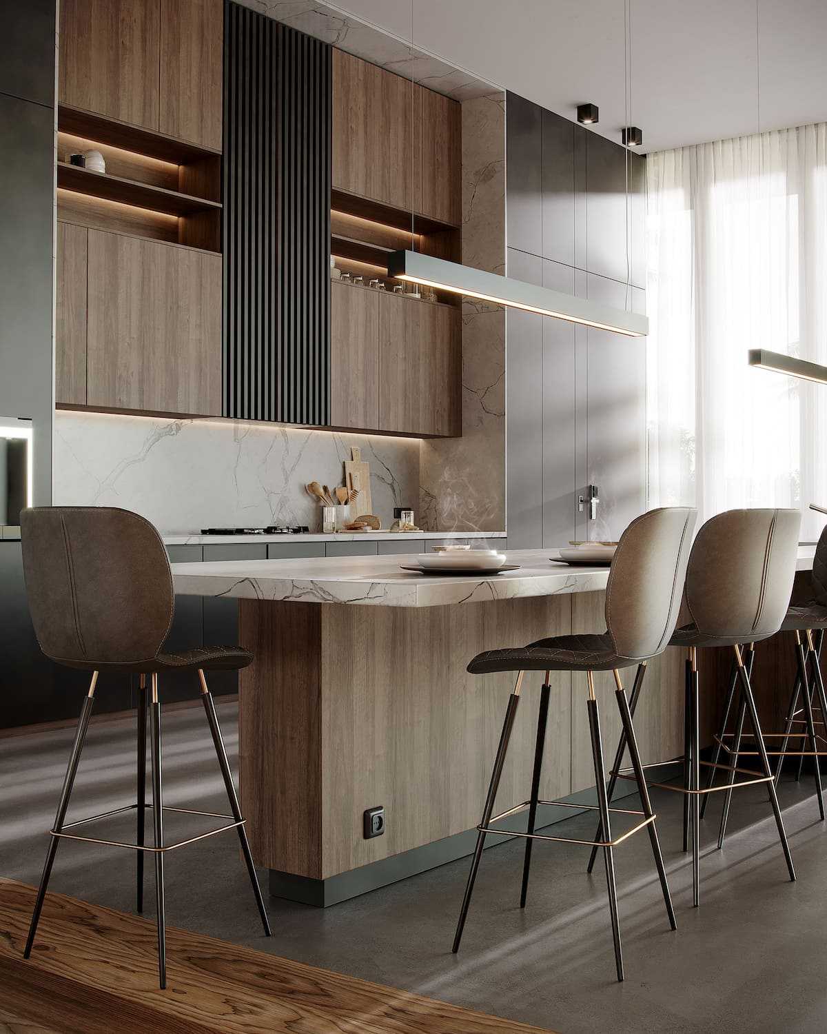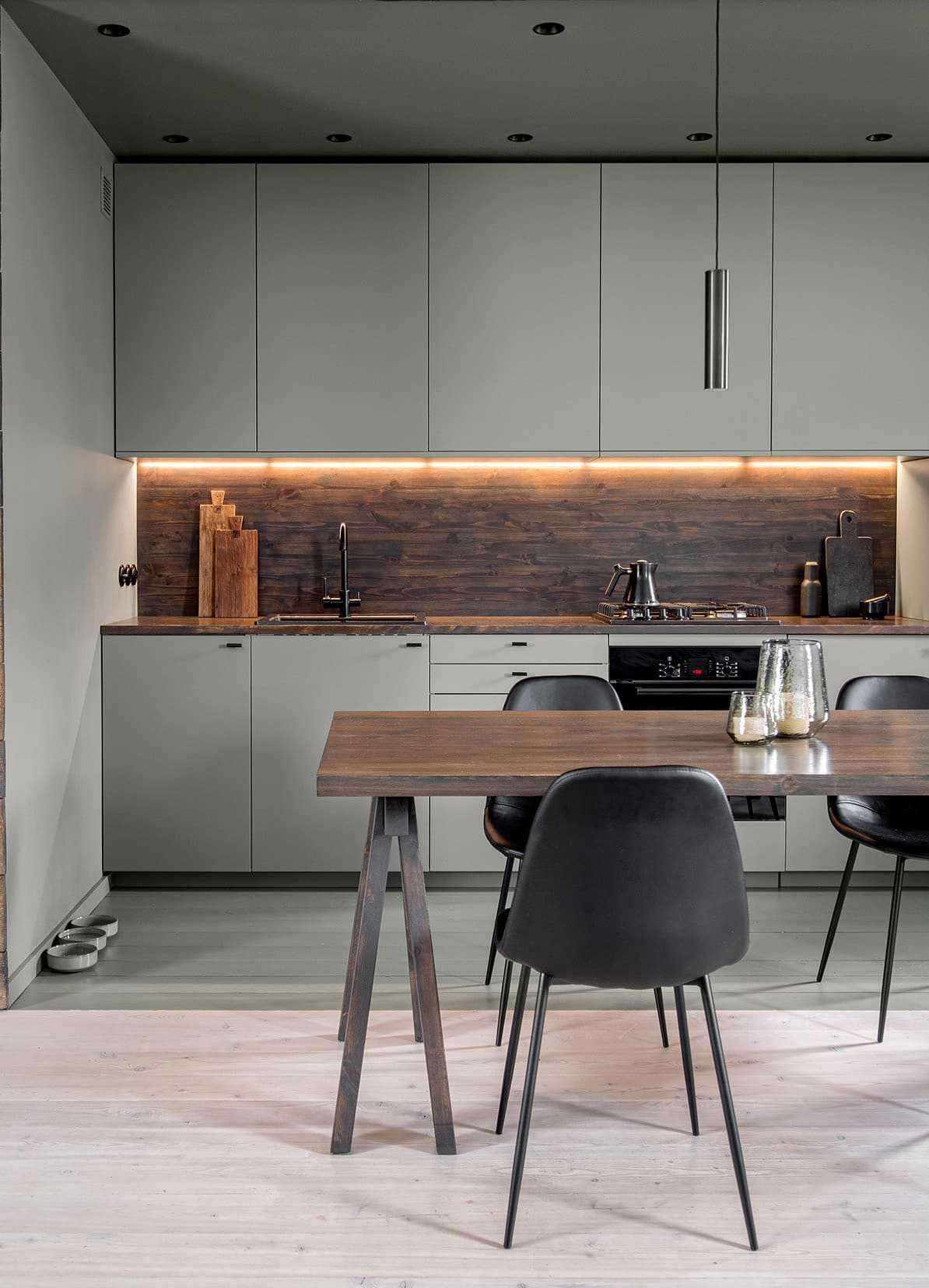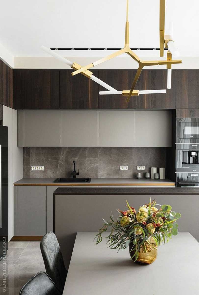 В данном случае чаще всего темно-коричневую кухню разбавляют пепельными тонами и металликом, что придает пространству строгости и в то же время роскоши. Также используются теплые бежевые оттенки в сочетании с серым.