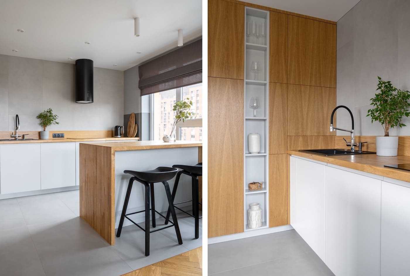Дизайн кухни с белым верхом и светло-коричневым низом