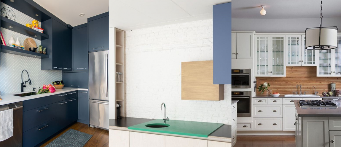 Присмотритесь к гарнитурам с разноформатными модулями, они будут смотреться интереснее классических. Смело комбинируйте шкафчики разной высоты и ширины.
