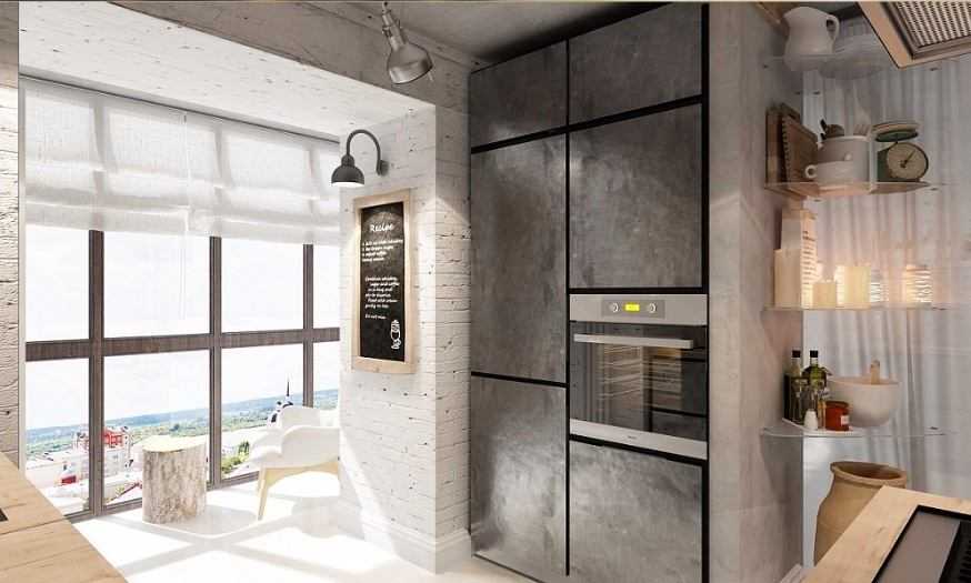 Рабочая зона кухни отделена от столовой прозрачной стеклянной стенкой. Встроенные духовка и холодильник стилизованы под бетонную стену и имеют графитово-серый цвет. Большое окно уравновешивает светлые и тёмные оттенки, делая кухню и зону столовой более интересными в плане освещения.