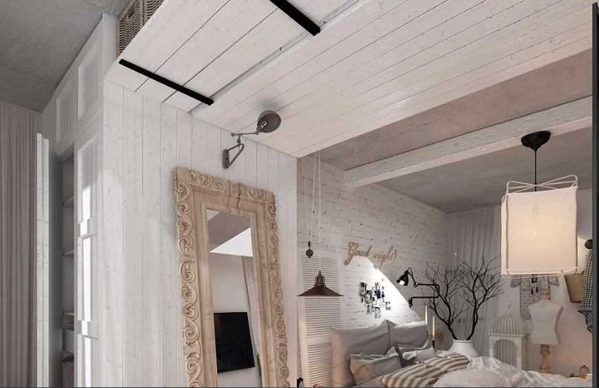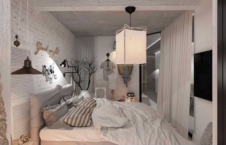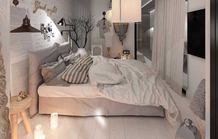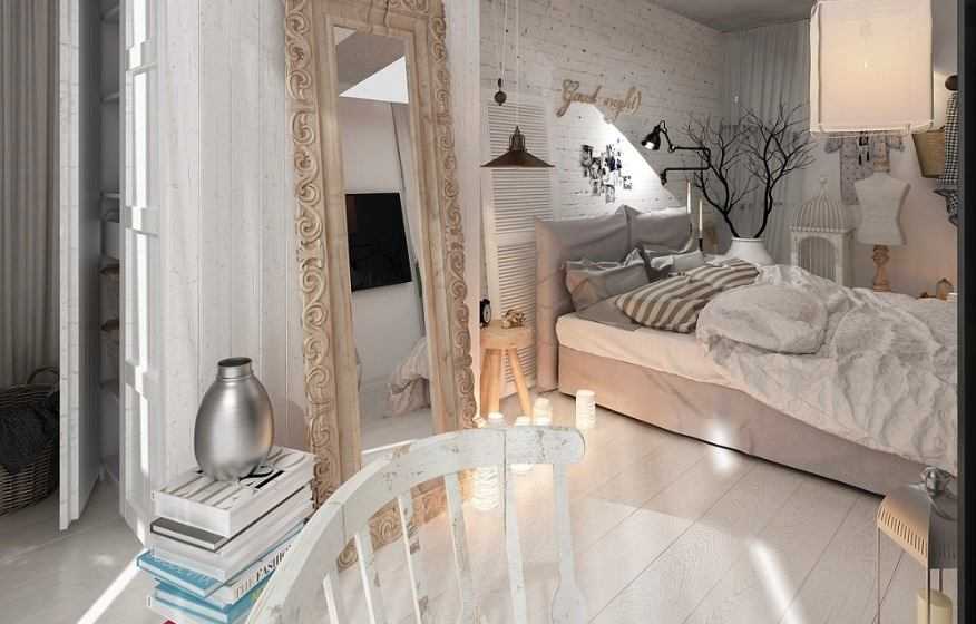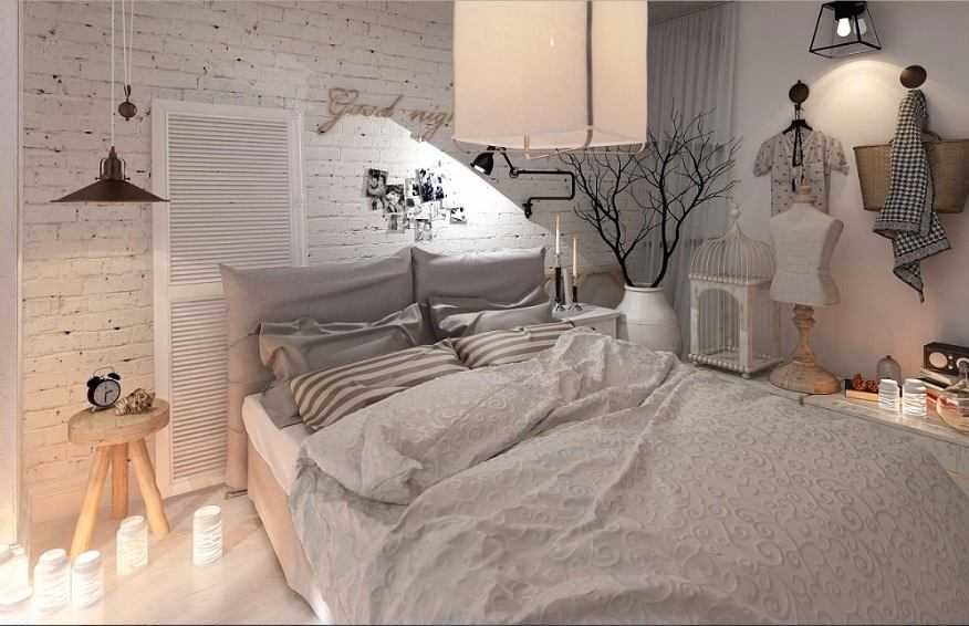Спальня у команды Izumoff получилась мягкой, нежной, очаровательной и даже романтичной. В интерьере комнаты преобладают белый, персиковый, светлый серо-голубой, светло-лиловый цвета. Комната наполнена яркими и оригинальными аксессуарами в виде клетки для птиц, миниатюрного манекена для украшений, хрустальных флаконов для духов, небольших ваз и свечами в подсвечниках. Несмотря на это комната не кажется перегруженной. Всё на своих местах и ничего не режет глаз.