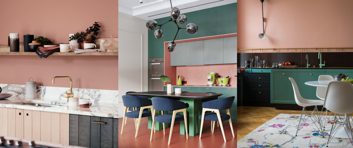 Творческое решение — сочетать в интерьере кухни сразу два акцентных цвета. Не обязательно выбирать «вырвиглазные» оттенки, сложные «припылённые» тона тоже будут смотреться эффектно.