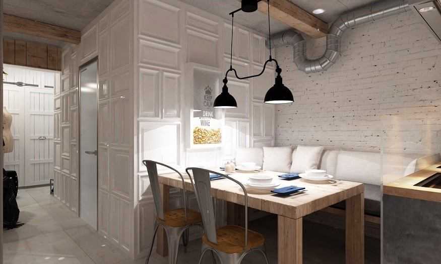 Кухня и столовая зона в квартире совмещены. Это оказалось более правильным решением с точки зрения зонирования небольшого пространства жилого помещения. На кухне мы видим домашнюю жаровню, снабжённую отличной вытяжкой, большие рабочие поверхности столов и очень удобно расположенные шкафчики для домашней утвари.