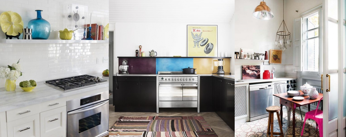 Даже одна стена занимает много видимого пространства, если вы не готовы давать цвету столько места, поселите в кухне несколько ярких аксессуаров или выделите цветом фартук.
