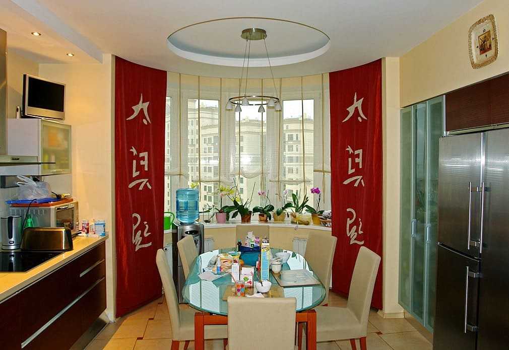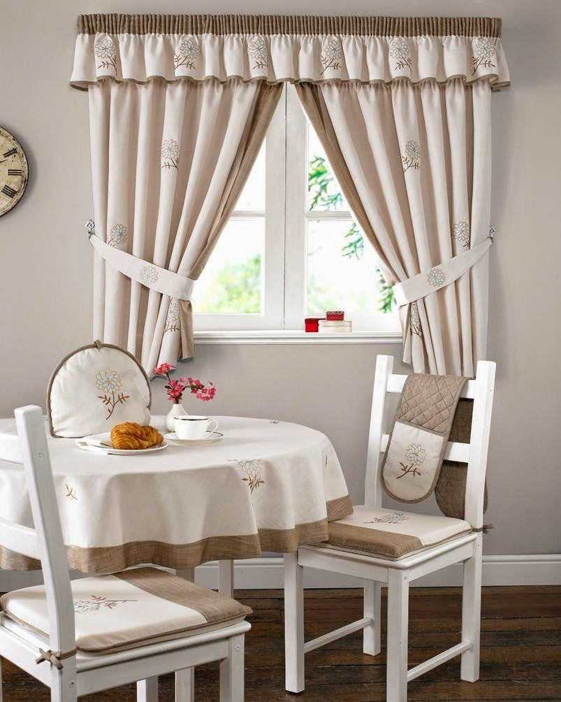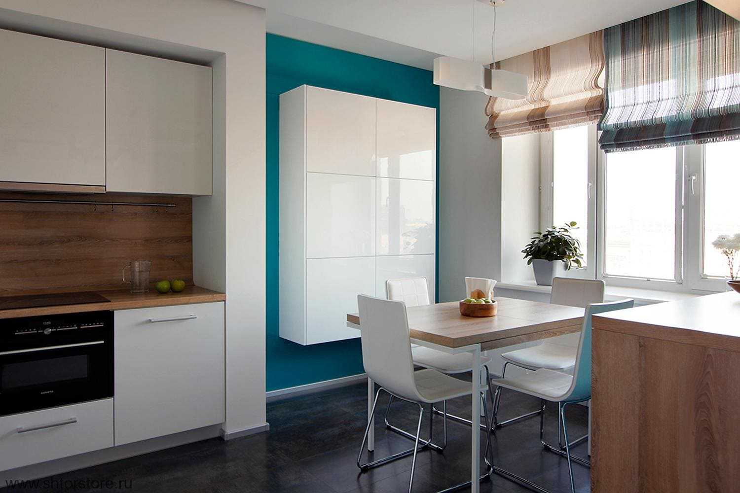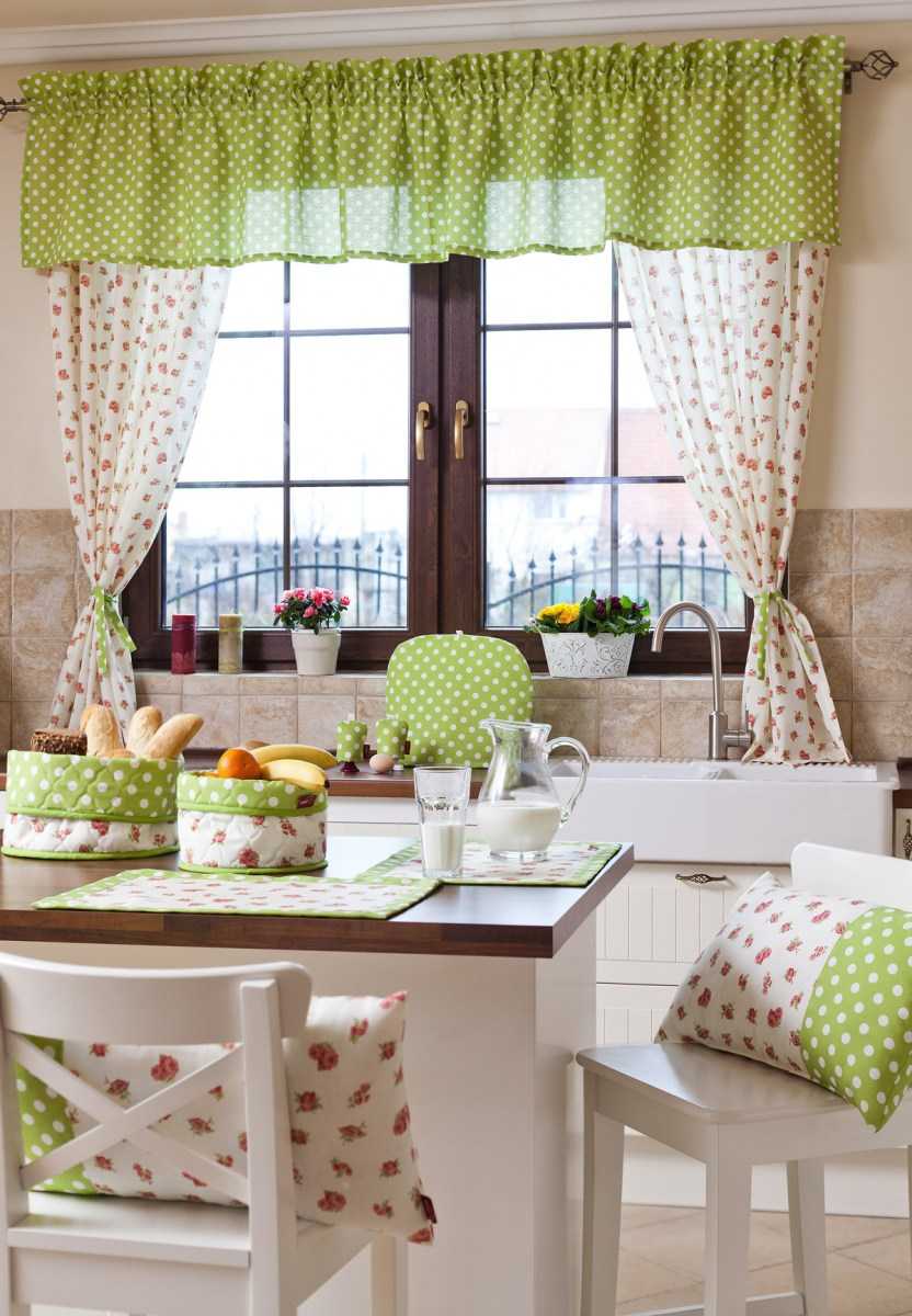 Важно, чтобы ткань, цвет или мотив рисунка повторялись в некоторых деталях – обоях или текстильном оформлении кухни. Модные шторы в кухне помогают сделать интерьер современным