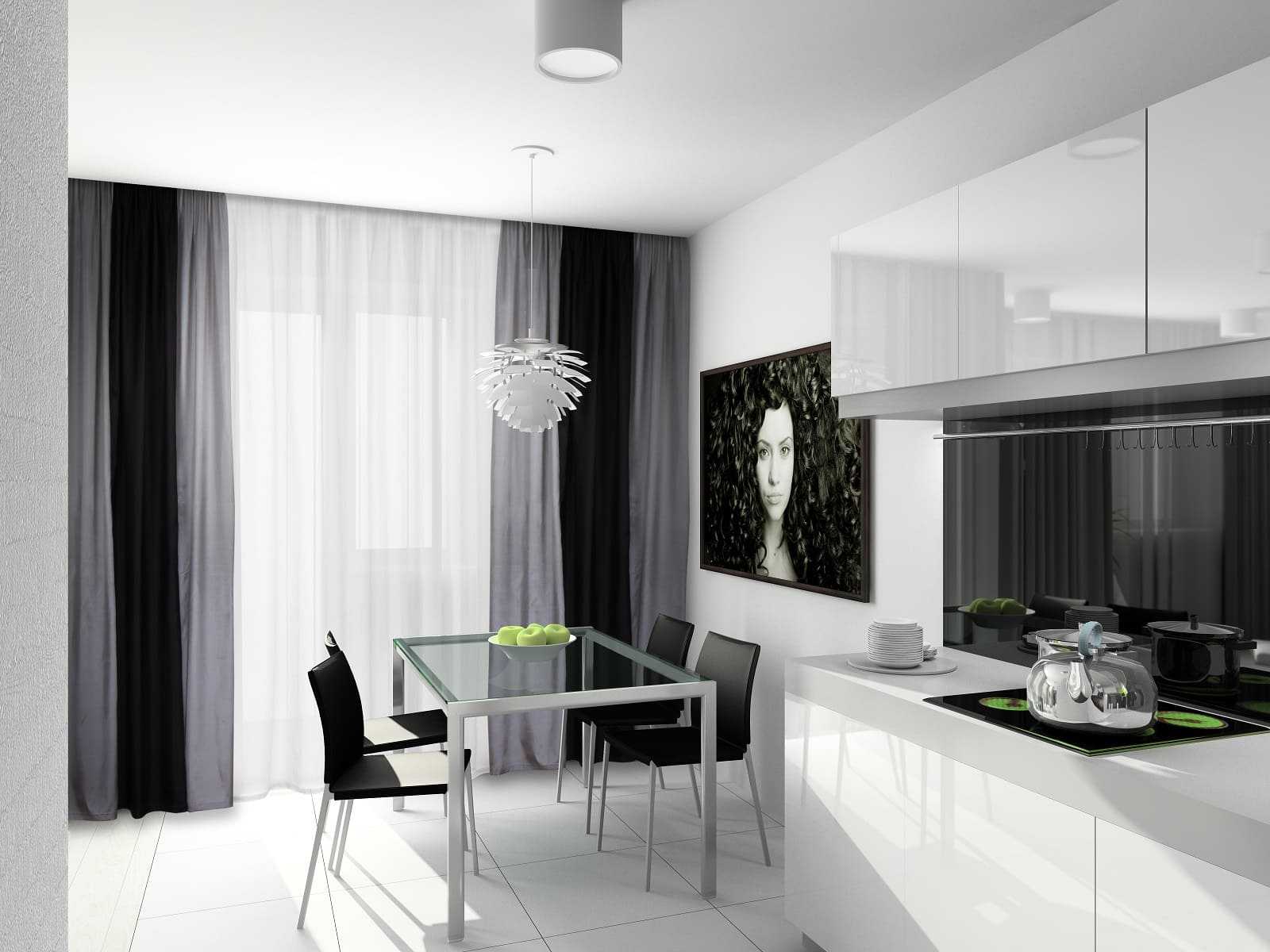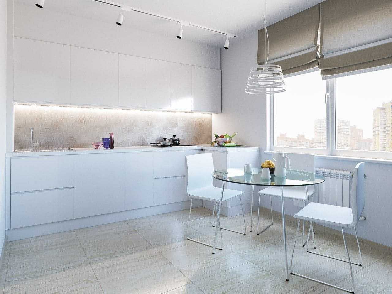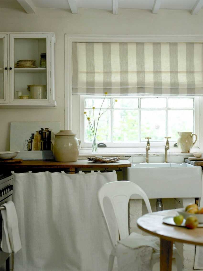 Это выбор для маленьких кухонек. Характерно практически полное отсутствии мебели, украшений. Ткань молочного цвета на окнах – не будет выделяться, но придаст уют.