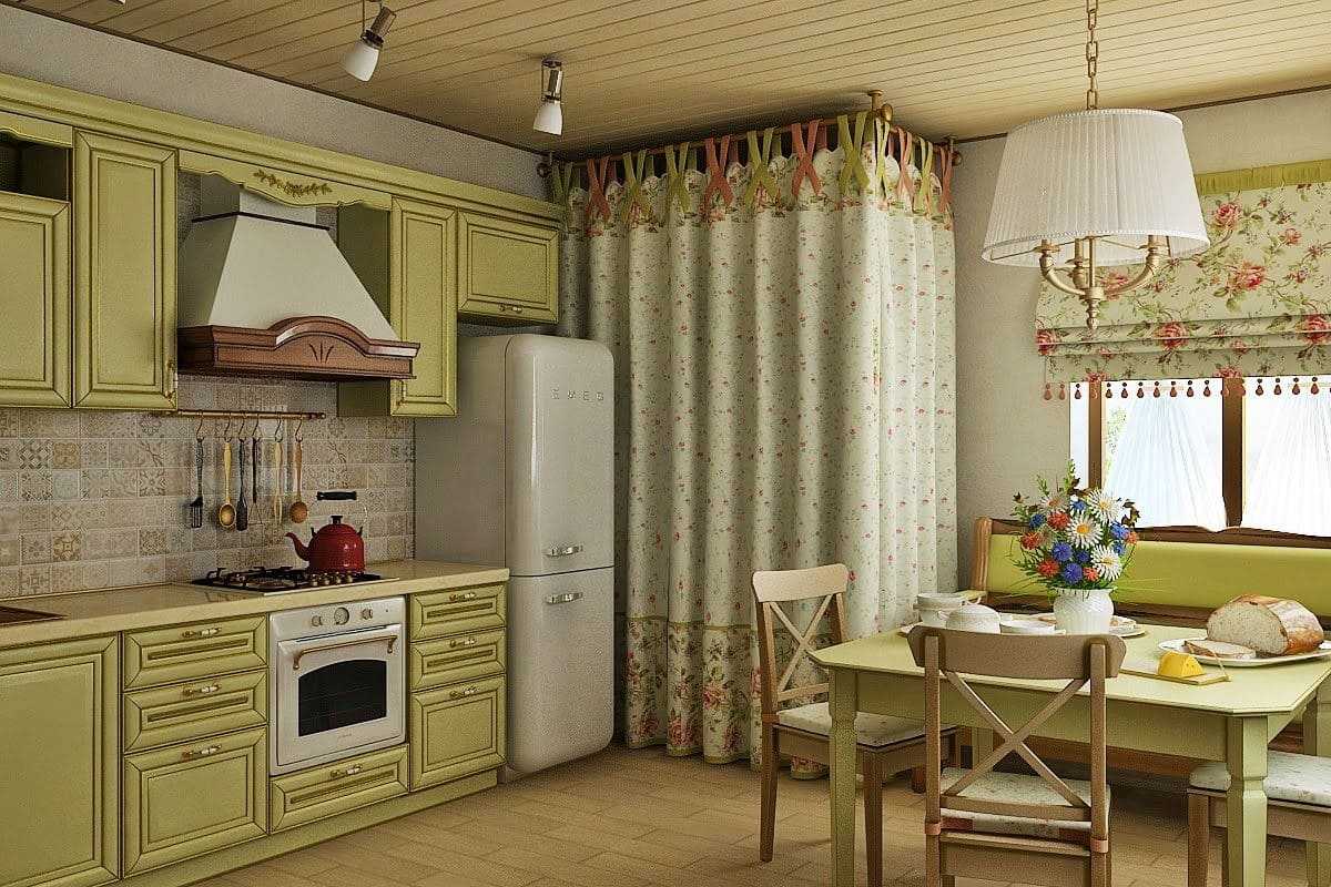 Популярный дизайн в России для небольшого пространства, шторы на кухню оливкового цвета сделают ее по-домашнему уютной.