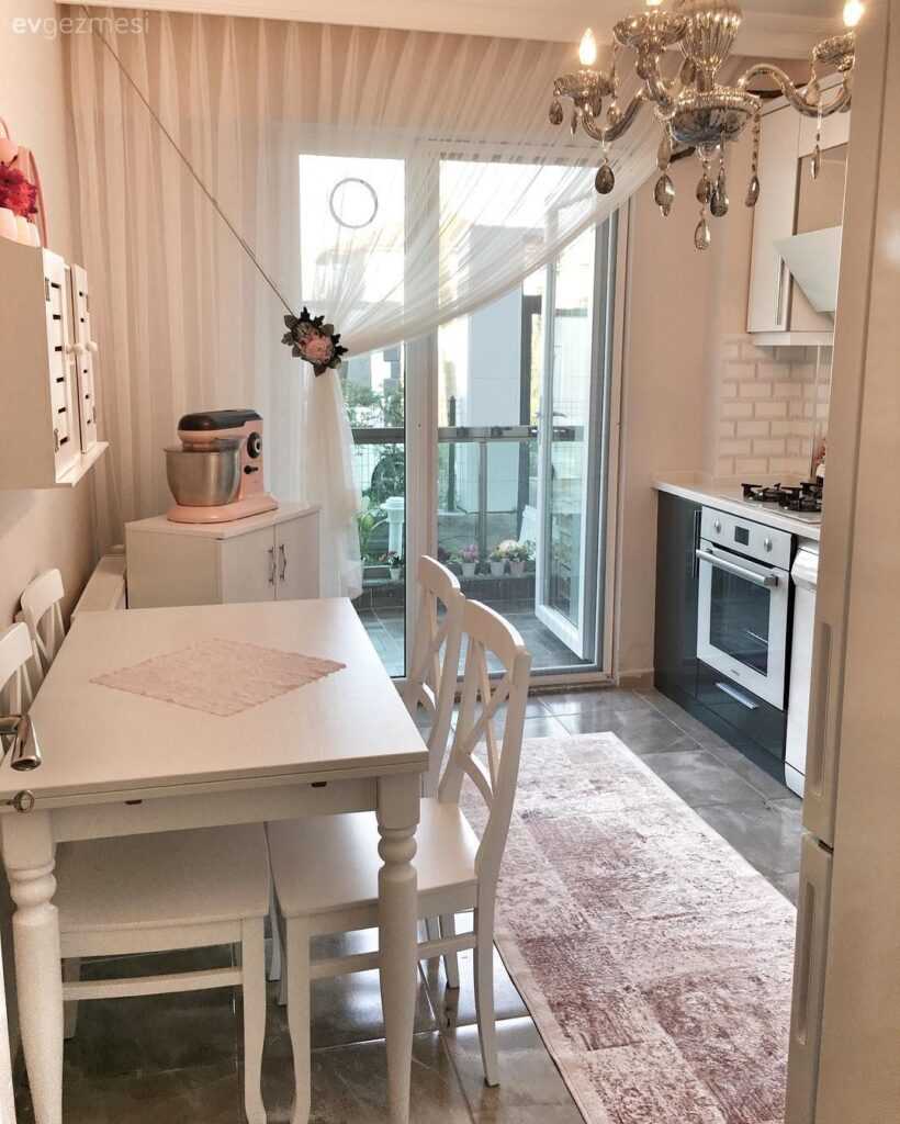 Далее рассмотрим новинки, а также не теряющие актуальности привычные варианты для оформления интерьера. Чтобы максимально расширить кухонное пространство и наполнить его воздухом, дизайнеры используют интересный приём, декорируя небольшое окно длинными шторами в пол. Так потолок кажется выше, а окно – больше