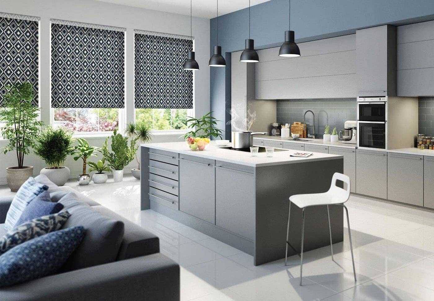 По-прежнему популярен геометрический орнамент, но рисунки на шторах в интерьере кухни смотрятся модно, только если отделка и мебель выдержаны в лаконичном ключе.