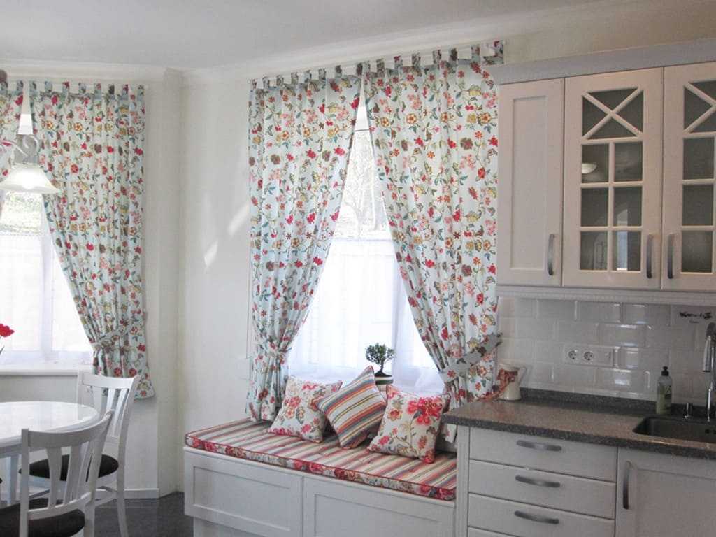 Если хочется создать романтичный интерьер в кухне, подойдут австрийские или французские пышные шторы, которые по длине достигают уровня подоконника