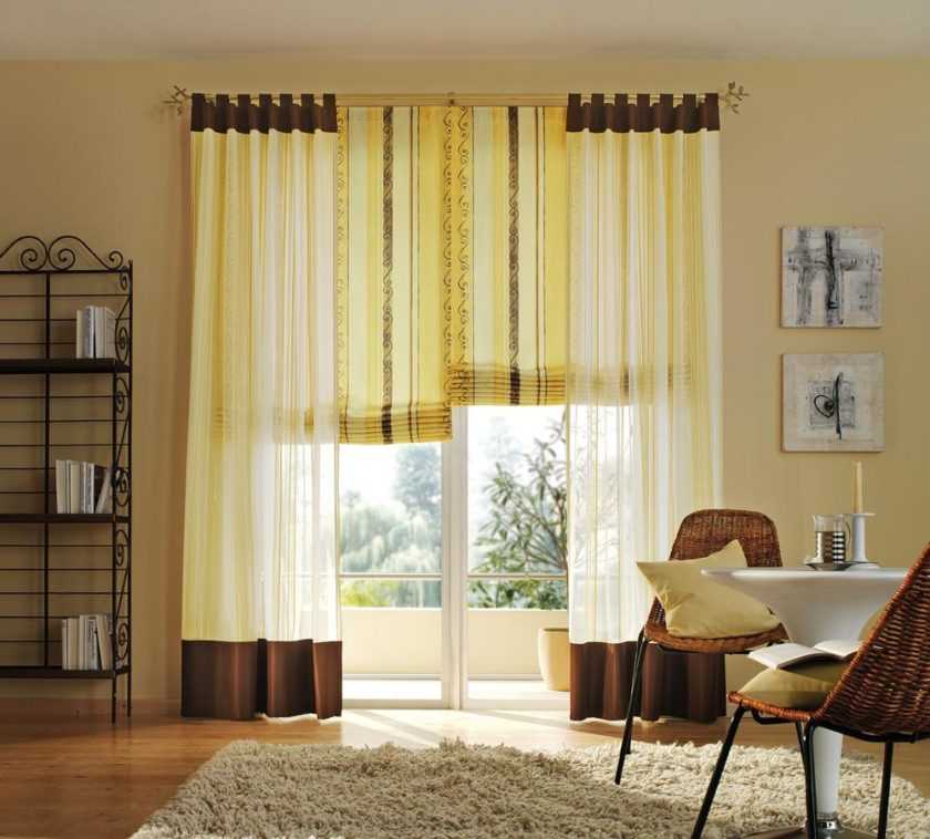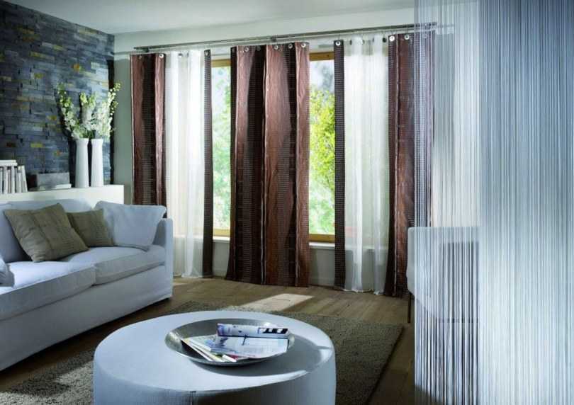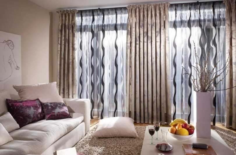 Это актуально в гостиных с большими окнами, где полупрозрачный материал закрывает все окно, а более плотные располагаются по краям и служат для завершения композиции.