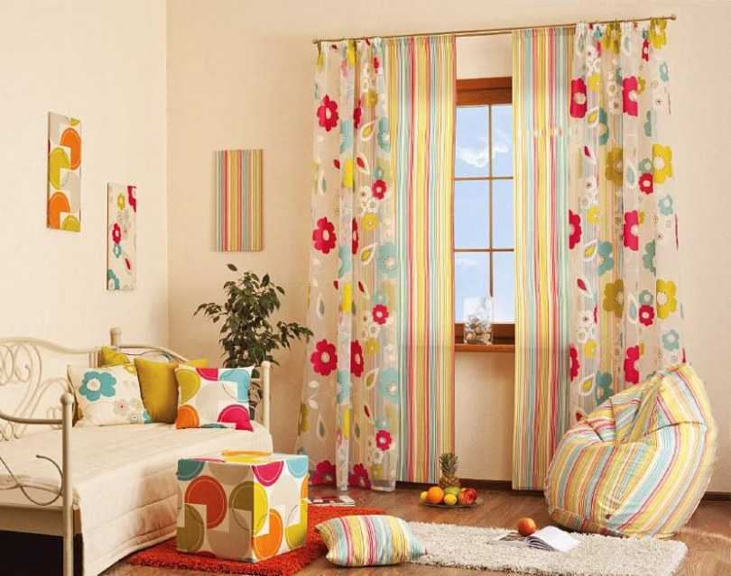 - сочетания цветных и однотонных занавесок;