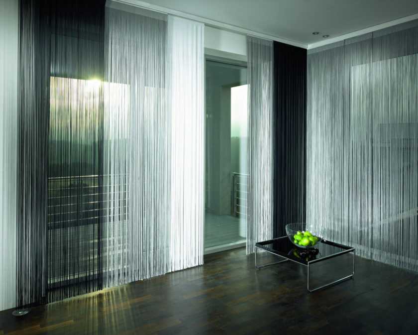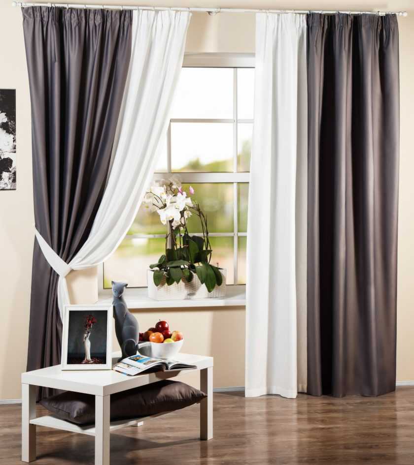 монохромные занавеси из материалов разной плотности;
