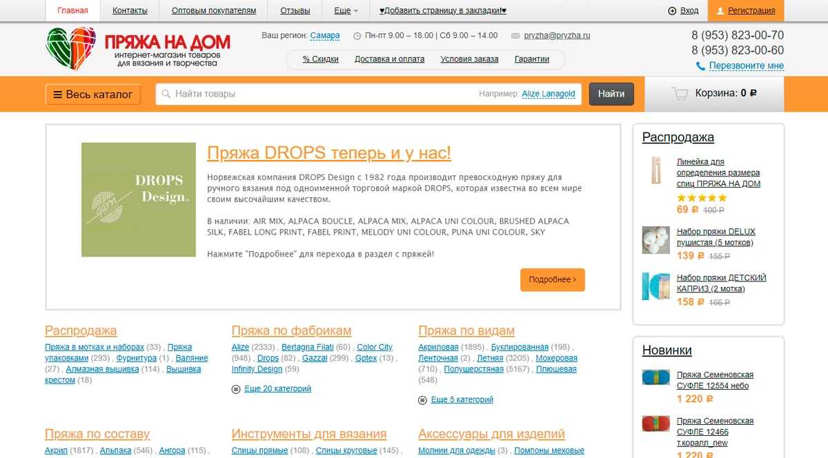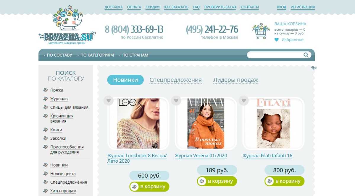 Ознакомьтесь с нитками для вязания, популярные у других мастериц. Для этого нужно перейти в раздел «Лидеры продаж». Итальянская пряжа Сеам Mambo стоит 375 рублей и идеально подойдет для пледов, детских шапок и шарфов. Вы можете оформить покупку в один клик, указав контактные данные или зарегистрироваться на сайте и получать накопительные скидки, а также выгодные предложения. Магазин пользуется популярностью у вязальщиц и занимает 5 место в рейтинге.