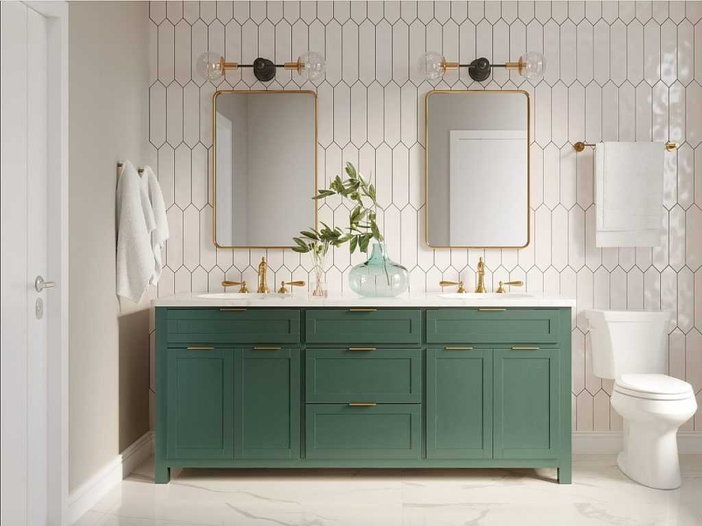 Матовая текстура стен, изысканный текстиль и аксессуары помогут смягчить вызывающий контраст. Это вдвойне верно для ванной, которую современные тренды в дизайне превращают в аналог гостиной. Особенно актуально сочетание молочно-белой плитки и зелёных мебельных фасадов.