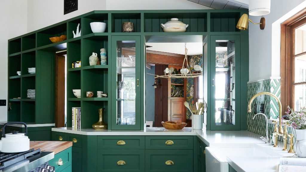 В первую очередь, его выбирают для мебели, неважно, кухонный ли это стол или тумба под умывальник в ванной. Фасады, окрашенные в оттенки мха, мяты или малахита, великолепно сочетаются с деталями из натурального дерева и латуни