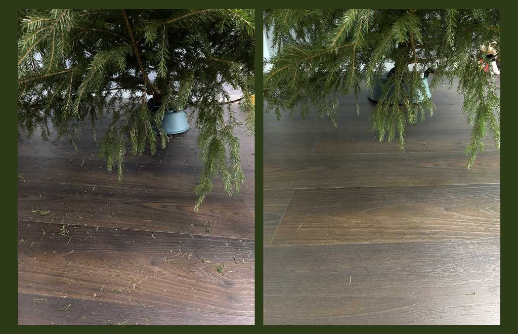 Тем не менее, отказаться от самостоятельной уборки полностью не выйдет. Чтобы подтвердить этот факт, провел эксперимент. Оставил на полу два вида мусора: иголки, которые обсыпались с новогодней елки после установки, а также опилки после подпила ствола для инсталляции в подставку с водой.