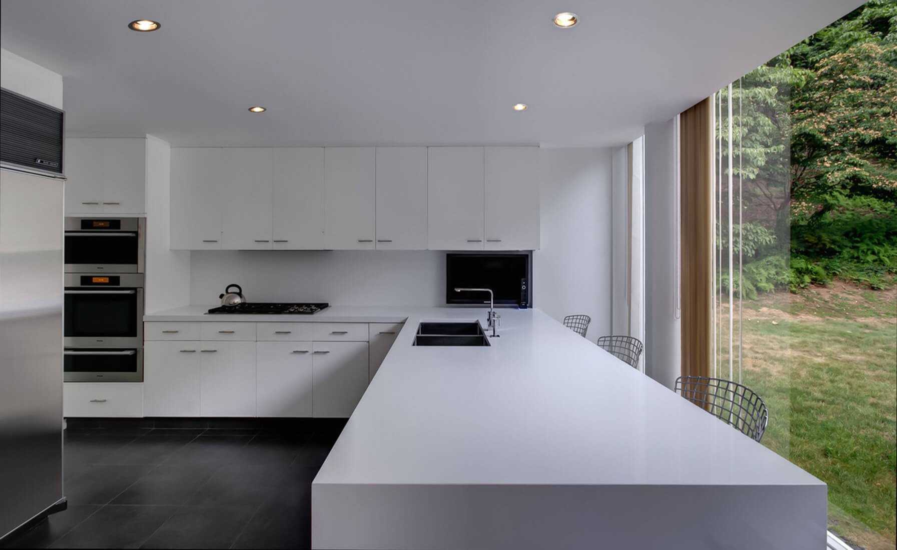 Разбить однотонный белый цвет стоит теплыми деревянными вставками, например, столешницами с такой тематикой. Альтернативой этому цвету могут быть и другие, приглушенные цвета, например, графитовый, бежевый, серый и даже черный.