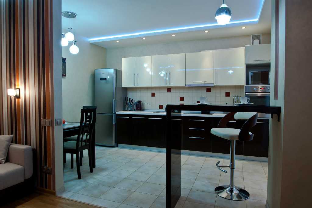Его можно соорудить из гипсокартона, но лучшим решением будет установка натяжного потолка с глянцевым блеском. Такой потолок может быть одноуровневым, также можно соорудить два или больше ярусов потолка (все зависит от размеров кухни).