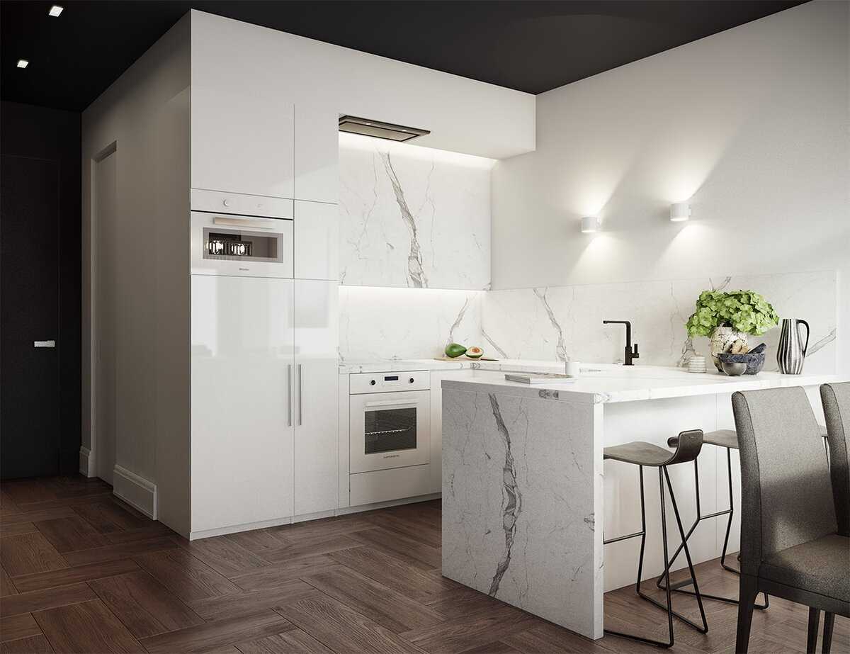 Многофункциональная кухня, оформленная в стиле минимализма в черно-белом варианте Источник roomester.ru