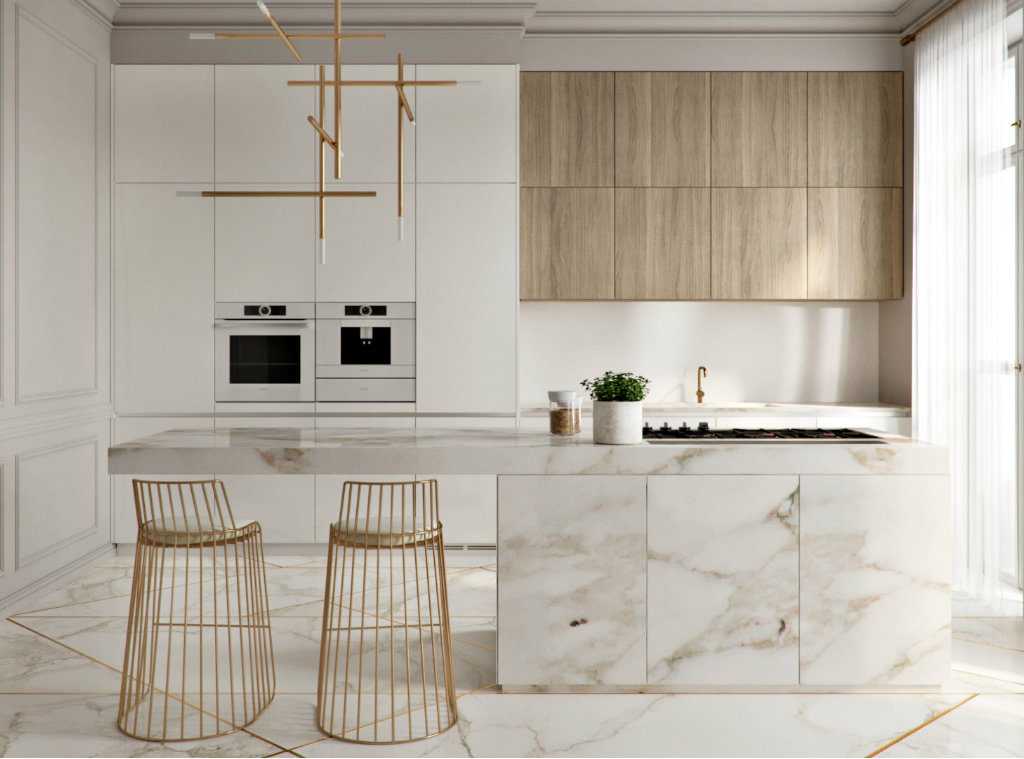 Во многом кухни на картинках выглядят красиво и дорого благодаря люксовым материалам: камень, каменный шпон, паркет на полу, массив на фасадах, натуральное дерево на столах и барных стойках.