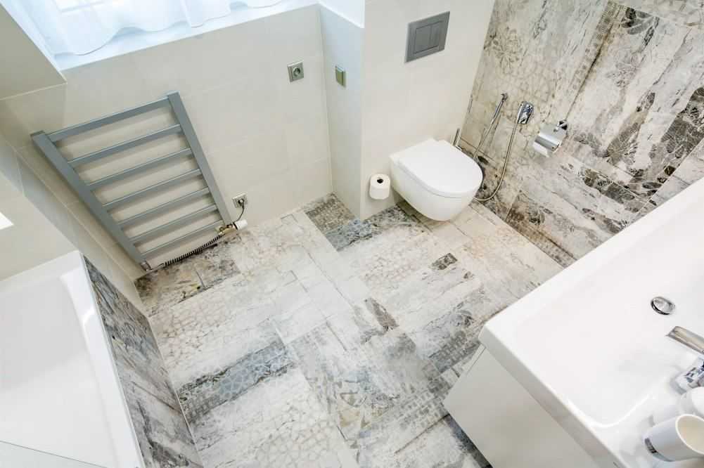Мрамор — чрезвычайно элегантный отделочный материал, который в основном сделан из кристаллического кальцита или доломита. Будет ли мрамор подходить в качестве плитки для ванной комнаты? Конечно! Подумайте о выборе натурального сырья, если вы заботитесь о полах с подогревом — материал хорошо проводит тепло, поэтому температура в помещении быстро повысится.