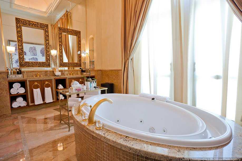 Античную атмосферу создает отдельностоящая ванна на подиуме или в эркере. Несмотря на свою высокотехнологичность, классическому стилю подойдет и джакузи: главное добавить изделию изящных элементов. Например, установить экран с декоративной решеткой.