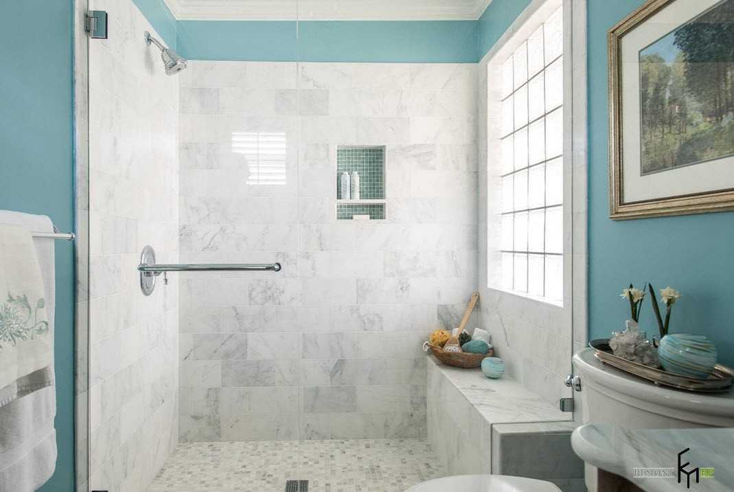 Всего лишь одна стеклянная перегородка способна создать пространство для организации душевой. Современные аксессуары для душа и мраморная отделка создали невероятно приятную атмосферу для водных процедур.