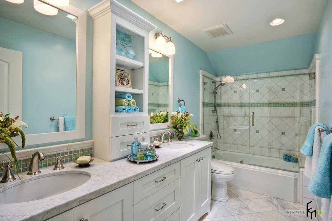 Наиболее комфортным и правильным решением оказывается применение пастельных оттенков – голубой, бежевой или зеленой красок. Далее нужно решить, как именно они будут задействованы: одно дело – продолжение общей гаммы в используемых аксессуарах, и совсем другое – построение интерьера на контрасте.