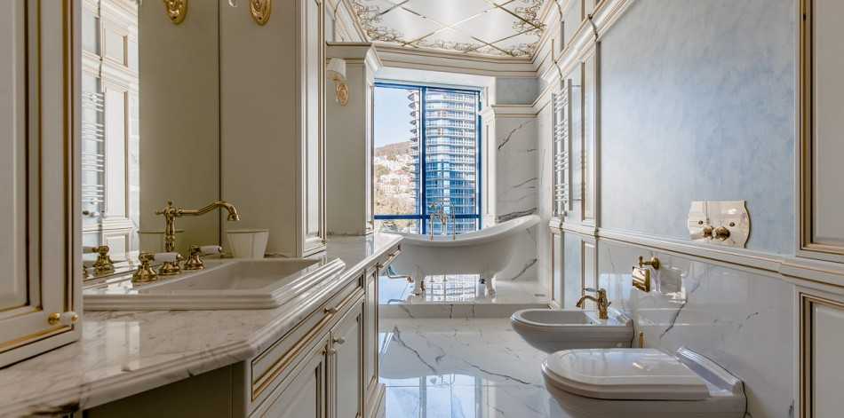 Гармония линий и цветовых сочетаний, тщательно выверенные композиции, сдержанная роскошь — вот основные приметы этого стиля. При оформлении ванных как никогда оказывается уместным использование таких классических материалов, как натуральный или искусственный камень, мрамор и керамическая плитка. В сочетании с резьбой, позолотой и лепниной они создают то самое ощущение красоты, изысканности надёжности и комфорта, которыми примечательна классика.