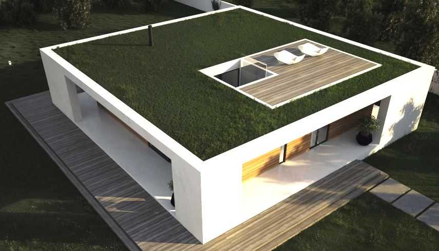 Дома в стиле минимализм могут иметь скатную конструкцию. Но наиболее распространенными являются плоские крыши, на которых можно смонтировать световые люки, солнечные батареи, обустроить террасу, смотровые площадки и зоны зеленой инверсионной кровли.