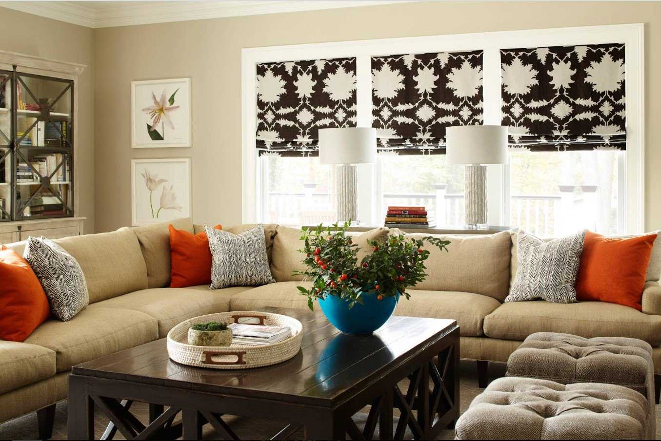 Если гостиная выполнена в сочной гамме, в неё желательно приобрести шторы белого оттенка без каких-либо орнаментов. Они сделают общий вид комнаты более изысканным.