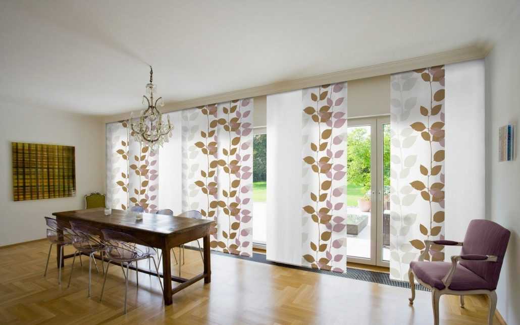 - Японские – похожи на огромные жалюзи, каждая широкая полоса которых перемещается по собственному карнизу. За счет этого их можно выстраивать в интересные композиции, наводя друг на друга в разной последовательности. Они всегда идеально прямые за счет присутствия внизу утяжелителя.