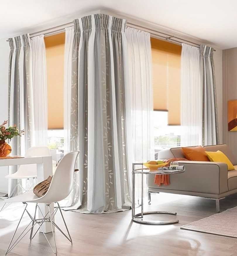 Часто комнаты драпируют сложными многослойными композициями. Но и в этом случае будут действовать цветовые законы, нужно будет лишь удачно скомпоновать несколько слоёв полотен по оттенку и научиться правильно видеть сочетание цвета штор.