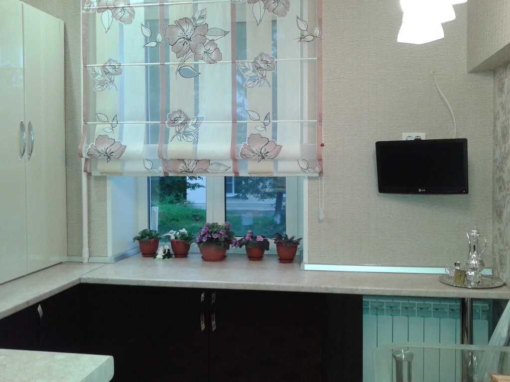 Рулонные занавесы освободят подоконник, этим они и удобны на маленьких кухоньках.