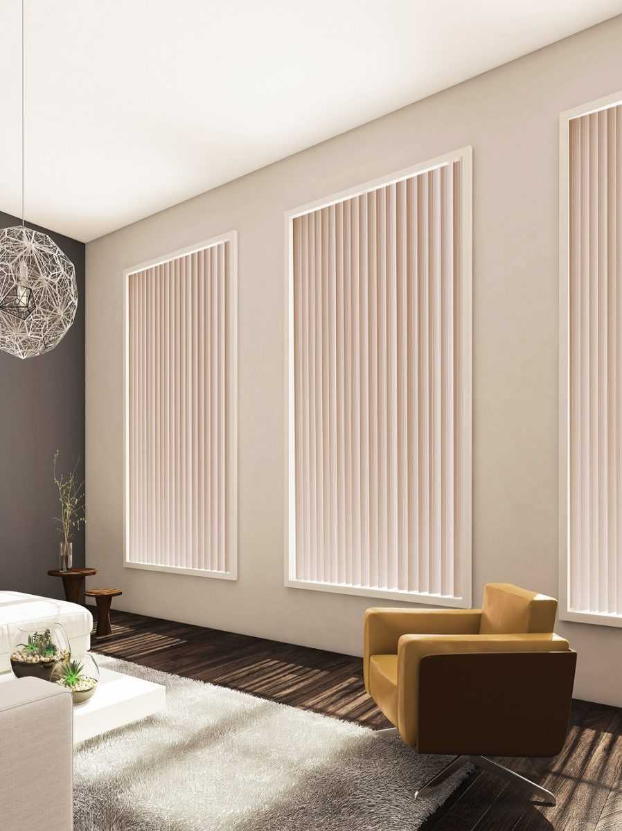 Торжественно выглядят большие вертикальные жалюзи с ламбрекеном. В моделях сочетаются несколько фактур и материалов, присутствуют декоративные элементы: ткань и пластик, металл и дерево, бамбук и стекловолокно.