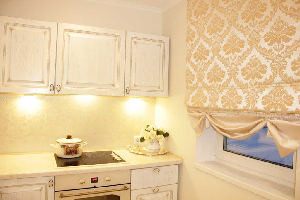 Римские шторы классические — такая модель представляет собой гладкое и ровное полотно, образующее при подъеме накладывающиеся друг на друга горизонтальные складки. Выглядят такие шторы очень просто и элегантно, они с легкостью вписываются в любой интерьер кухни.