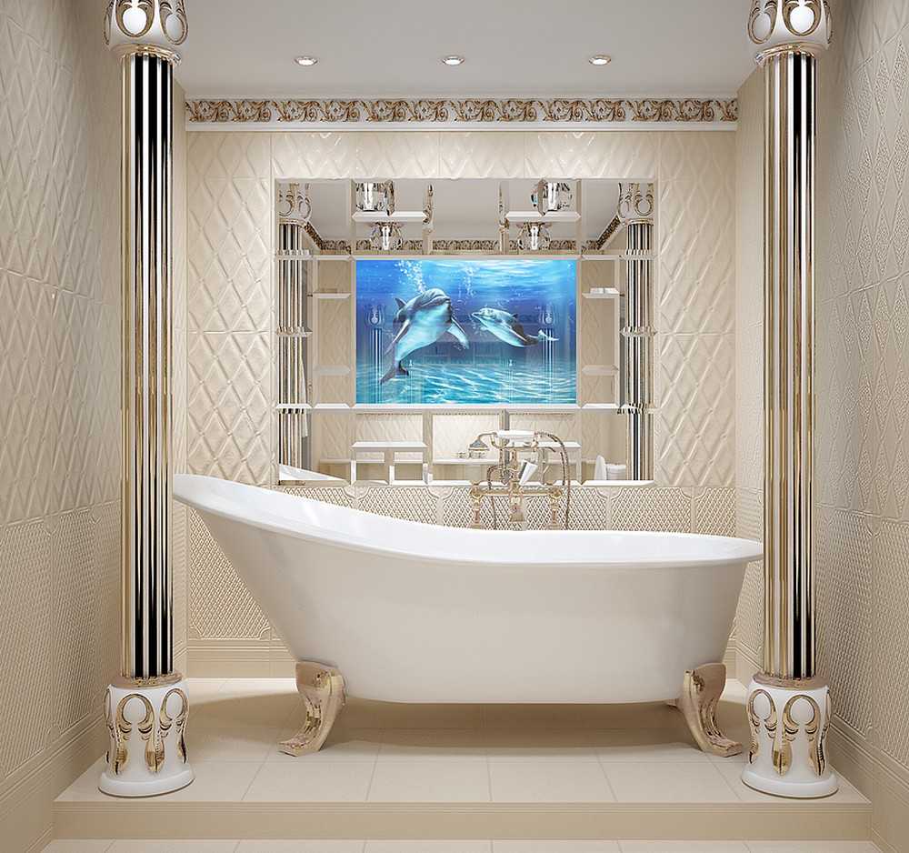 С помощью золотистой мозаики можно удачно оформить декоративные элементы на стенах. Также допускается использование сантехнических элементов в бронзовом или золотом оттенке.