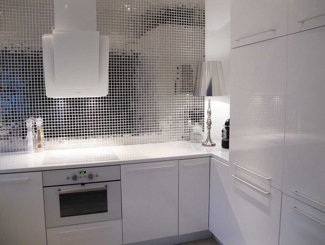 В декоре рабочей зоны используйте зеркальную плитку для фартука кухонного гарнитура. Выбирайте элементы мозаики, маленькие ромбы и квадраты. Перед решением укладки зеркальной плитки на кухне, задумайтесь над работоспособностью вашей вытяжки, плитка быстро потеряет блеск и покроется слоем жира, если вытяжка не справляется с работой.