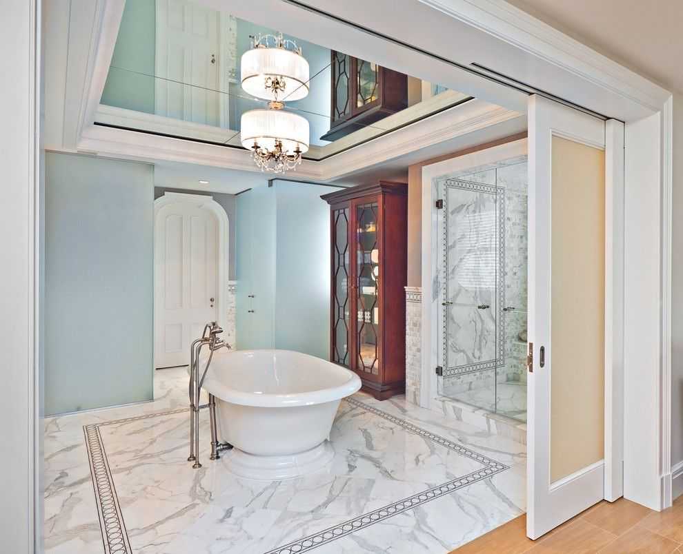 Визуальное совершенство. Такой потолок будет украшением помещения, он не только станет самым ярким элементом ванной комнаты, но еще и зрительно увеличит ее в несколько раз.
